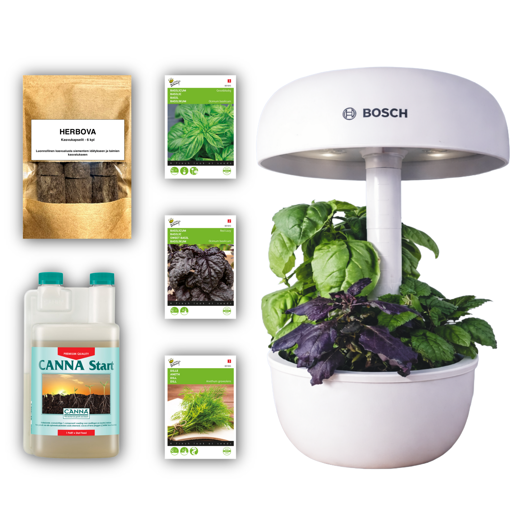 Tämä aloituspaketti sisältää kaiken tarvittavan kotikasvatuksen aloittamiseen. Bosch SmartGrow 3 huolehtii valaistuksesta ja kastelusta, joten sinä voit keskittyä nauttimaan sadosta.